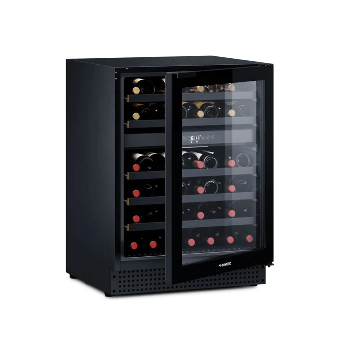 De capaciteit van de wijnkoelkast is verdeeld in 2 temperatuurzones; de zone boven heeft een temperatuurbereik van +4 °C t/m +22 en de zone onder heeft een temperatuurbereik van +12 °C t/m +22. In de wijnkoelkast kunnen in totaal 46 flessen wijn worden opgeslagen. De temperatuur is voor beide zones afzonderlijk in te stellen via een elektronische temperatuurregeling. Wijnflessen liggen in deze Dometic D46BB wijnklimaatkast horizontaal op houten lades, met zwarte fronten. De wijnkoelkast bevat 5 verwijderbare en uitschuifbare houten rekken met zwarte fronten. De wijnkoelkast beschikt over een deuralarm en verstelbare pootjes.